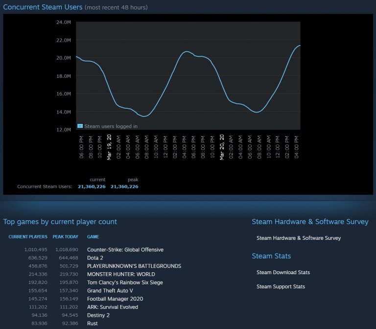 حدود 7 روز پیش ، Steam رکورد جدیدی را برای تعداد بازیکنان همزمان تعیین کرد و میزبان 2 میلیون بازیکن همزمان بود. اما اخیراً این رکورد توسط Steam شکسته شده است و این پلتفرم میزبان 7 میلیون بازی همزمان است. احتمالاً با شیوع ویروس Corona و جابجایی افراد به خانه های آنها ، این تعداد بیشتر می شود.