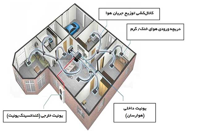 بواسطه کانال های انتقال هوا، جریان هوای سرد یا گرم بطور متوازن در محیط های تهویه شونده توزیع می گردد و تمامی فضا های واحد مسکونی یا تجاری را بطور کامل پوشش می دهد.