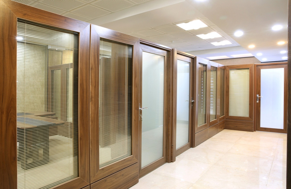 معمولاً در از شیشه های دو جداره استفاده می شود. با به کار بردن ام دی اف در پارتیشن دو جداره لبه های ام دی اف عایق سازی شده و ضخامت پارتیشن نیز زیادتر است. این پارتیشن اداری نیز در ارتفاع های مختلف قابل پیاده سازی است.