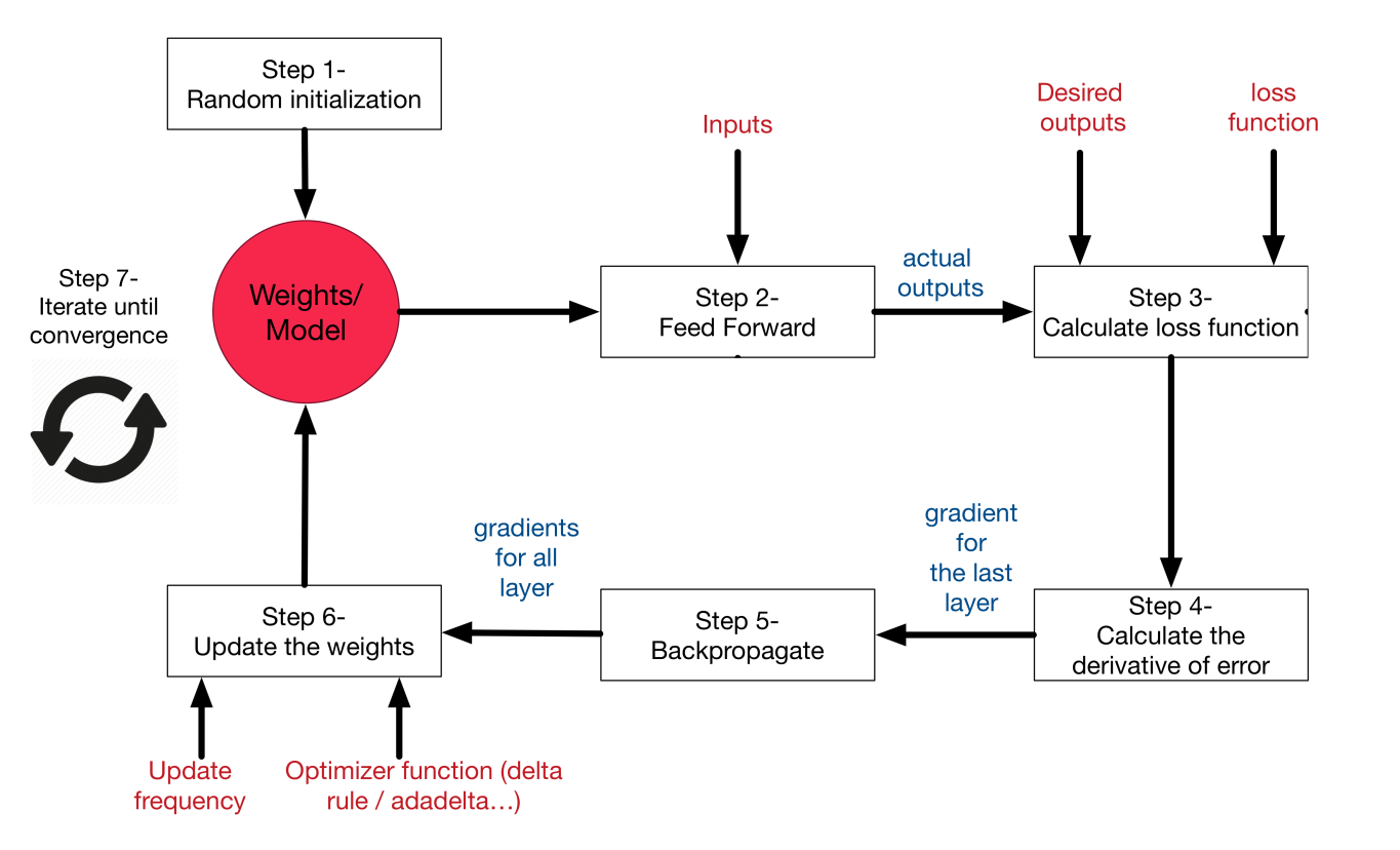 تصویر زیر مراحل آموزش شبکه عصبی را نشان می دهد. در مرحله اول ، پارامترهای شبکه را بطور تصادفی تنظیم می کنیم. در مرحله دوم ، نتیجه خالص را محاسبه می کنیم. در مرحله سوم ، خطای شبکه را با استفاده از عملکرد هزینه محاسبه می کنیم. در مرحله 4 ، شیب (مشتقات) را از تابع هزینه برای همه پارامترها محاسبه می کنیم. در مراحل 5 و 6 ، مقادیر پارامتر را با استفاده از فرمول بهینه سازی به روز می کنیم.