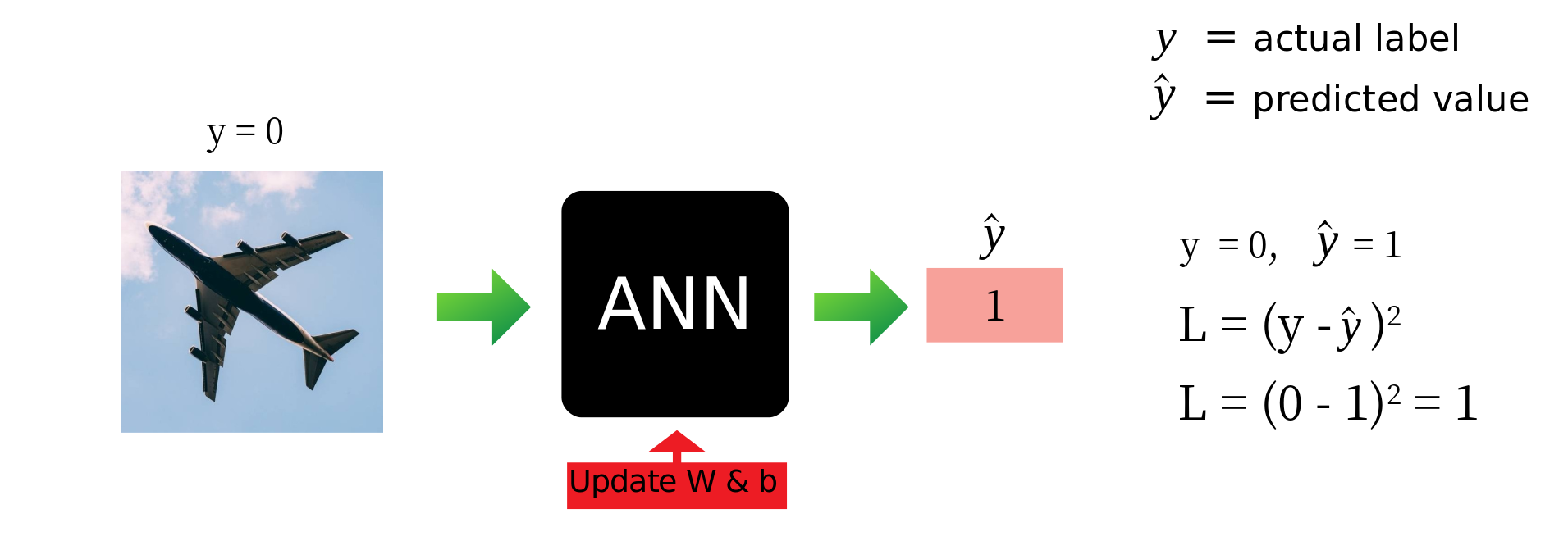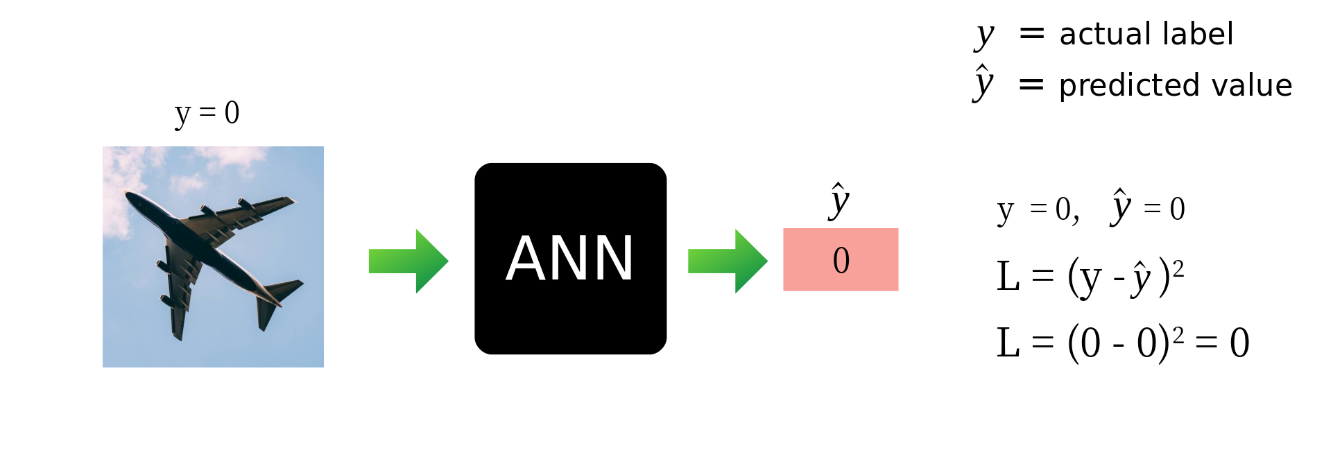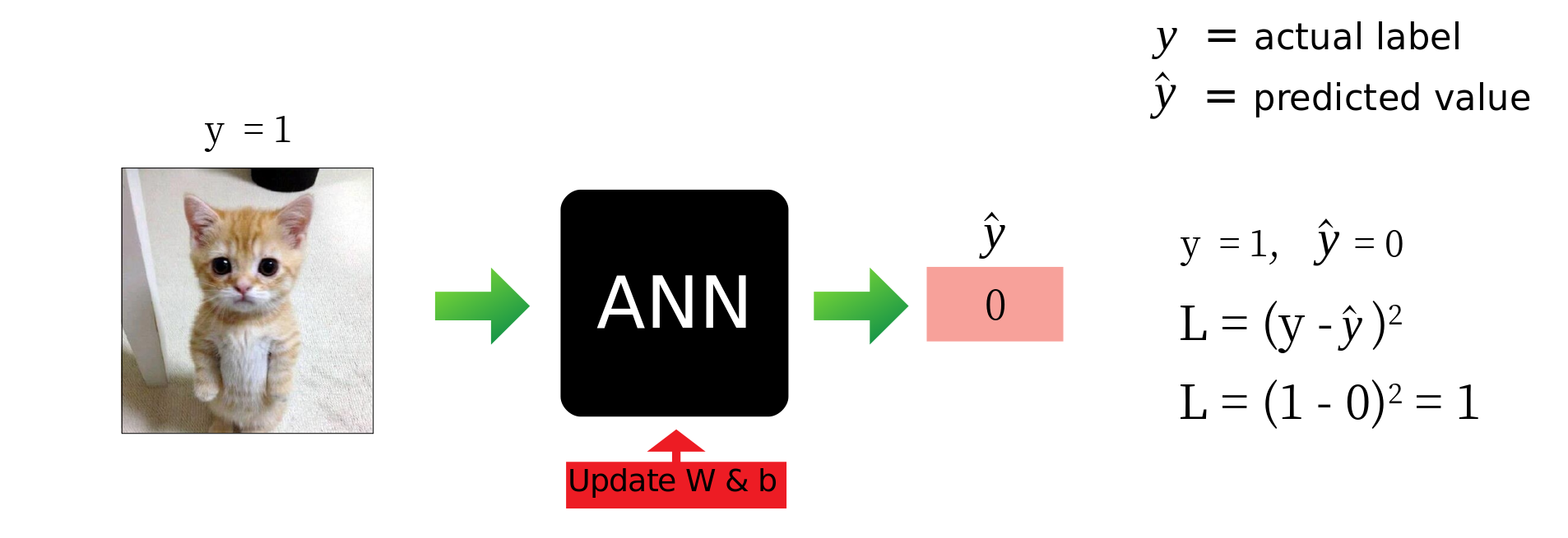 در تصویر زیر تصویری از شبکه عصبی (p برابر با 1) داده شده است. شبکه عصبی ما با دقت آموزش دیده 0 را در خروجی تولید می کند (یعنی این عکس گربه نیست). وقتی خطای شبکه خود را با استفاده از تابع هزینه (MSE) محاسبه می کنیم ، متوجه می شویم که شبکه ما هنوز به خوبی آموزش داده نشده است.