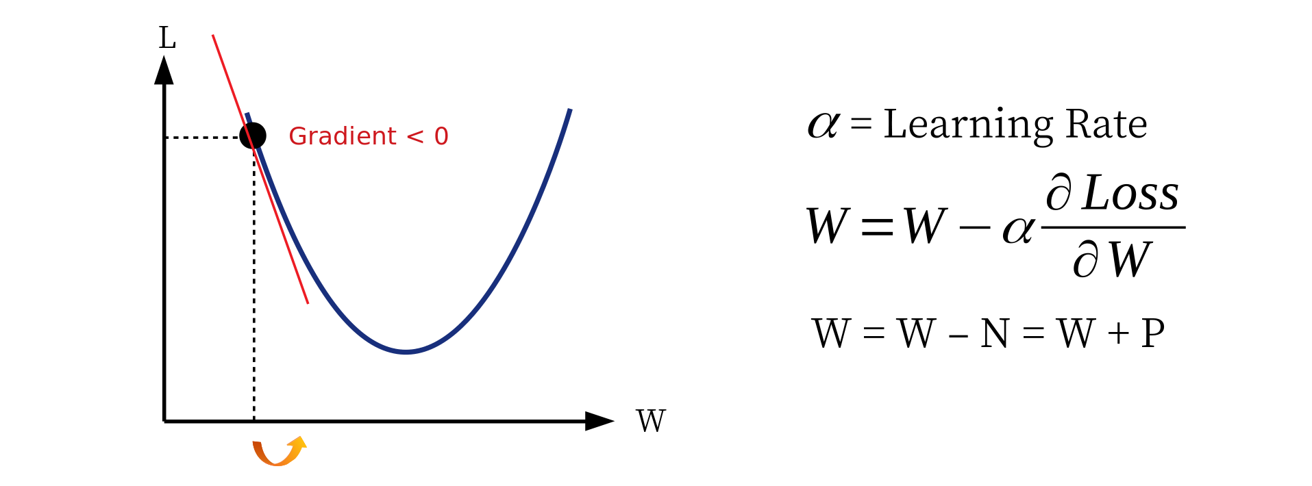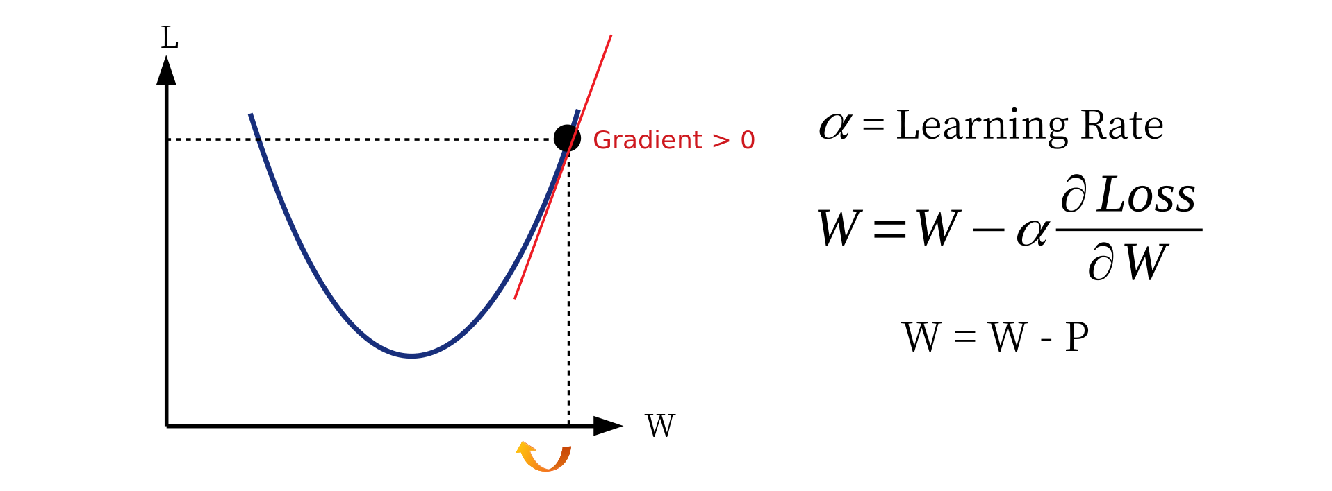 در نقطه w ، مشتق تابع هزینه (گرادیان) را محاسبه می کنیم و شیب خط را بدست می آوریم. در اینجا شیب خط (جهت از دست دادن در طی فرآیند w) یک عدد مثبت است. طبق فرمول بهینه سازی ، مقدار w برابر است با مقدار آن ، منهای یک عدد مثبت است. مقدار w به w بهتر می شود.