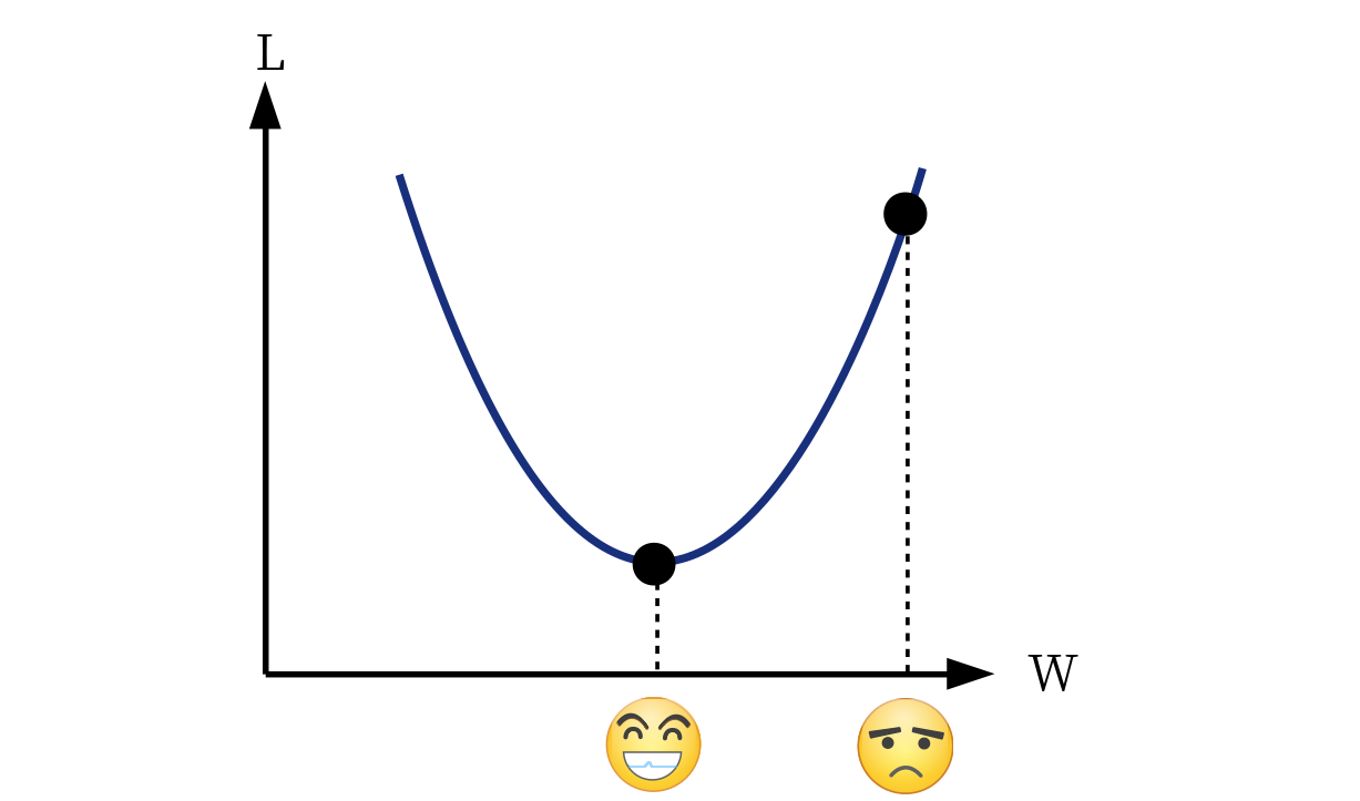 فرض کنید منحنی عملکرد هزینه ما همان منحنی آبی در شکل زیر باشد. همانطور که دیدیم ، تمام هدف ما این است که پارامترهای شبکه خود را کاهش دهیم تا بتوانیم عملکرد هزینه را کاهش دهیم. در شکل زیر ، محور عمودی مقدار خطای شبکه (از دست دادن) ما و محور افقی مقدار پارامتر شبکه ما w است. کاملاً مشهود است ، مقدار w که emojis برای خواندن انتخاب می کند ، حداقل مقدار خطای برای شبکه ما است. در مقابل ، او یک ایموجی غم انگیز را انتخاب کرد.