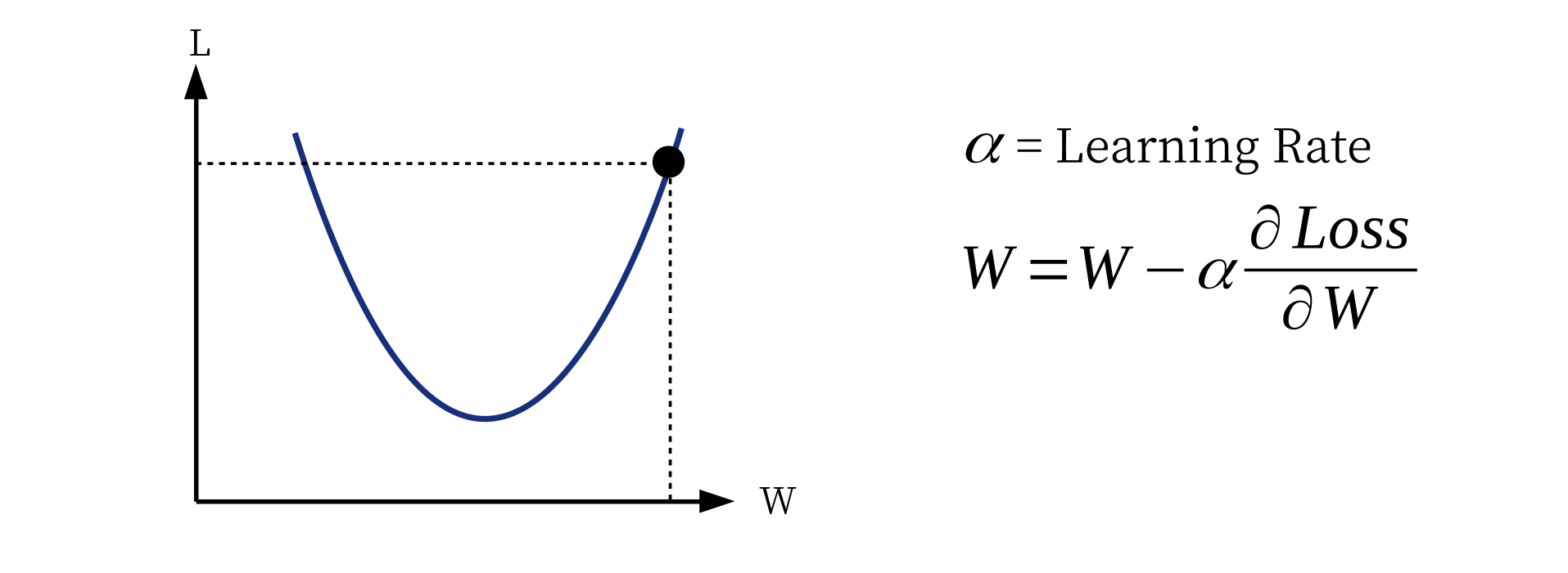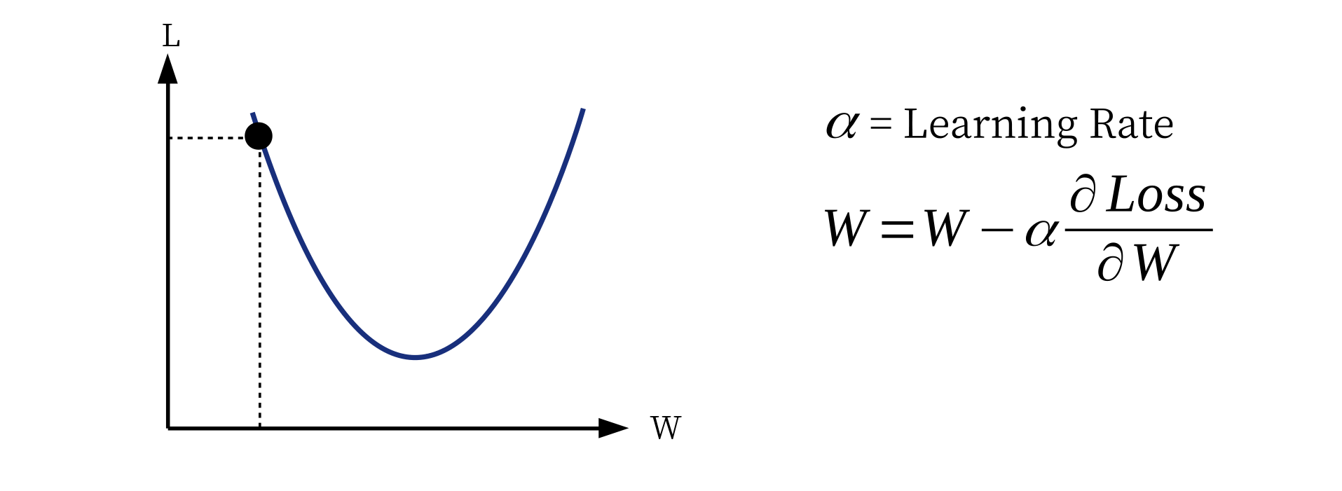 برای سادگی و تجسم فرمول بهینه سازی ، فرض می کنیم شبکه عصبی تنها یک پارامتر دارد. (اگر شبکه ما شامل 100 میلیون پارامتر باشد ، این روش است)