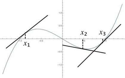 در نقطه x1 ، شیب خط یک عدد مثبت نزدیک به یک است. X2 یک عدد منفی نزدیک به صفر است و x3 یک عدد مثبت نزدیک به یک است. (شیب در نقطه ای که خط کاملاً افقی باشد صفر است و در نقطه ای که خط کاملاً عمودی باشد ، نامتناهی است)