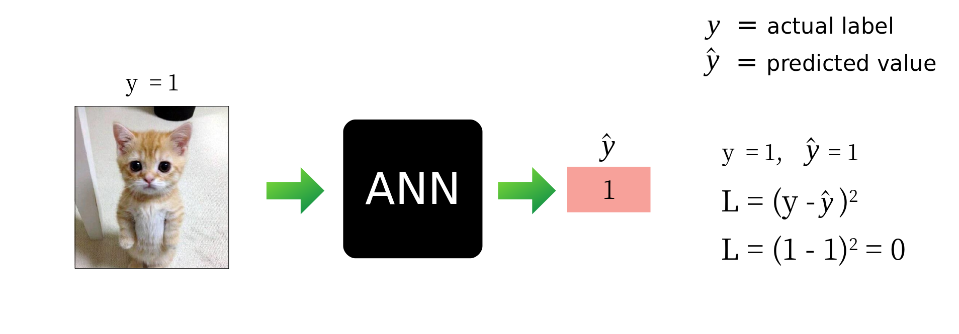 اگر در معادله فوق قسمت 1 را بر روی N و همچنین sigma (معنی ساده ای برای عادی سازی مقدار خطا وجود دارد) نادیده بگیرید و پرانتز های داخل را یادداشت کنید. y نشانه تصویری است که وارد شبکه عصبی می شود (در این حالت ، اگر تصویر گربه برابر 1 و مساوی 0 باشد). و y-cap برابر با مقدار خروجی شبکه عصبی ماست.